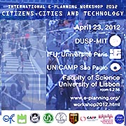 23 Abril 2012 "Workshop e-Planning Internacional 2012", 10h30 - 19h30, na Faculdade de Ciencias da Universidade de Lisboa, Campo Grande, Lisboa), com a participação da U. Paris, Unicamp (Brasil), MIT (USA), U. Madrid, e varias Universidades portuguesas (UA, UNL, UL, UTL), com presença de Directores de Faculdades e Institutos ISCSP e FCL .
